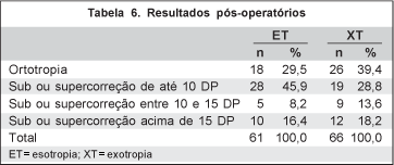 Os resultados pós-operatórios foram avaliados após período mínimo de 180 dias. Dos 153 pacientes operados, 26 (17%) perderam o seguimento ou foram examinados antes de 180 dias, sendo assim excluídos da análise pós-operatória. Obtivemos 44 (34,6%) casos de ortotropia, 47 (37,0%) com sub ou super correção até 10 DP, 14 (11,0%) com sub ou supercorreção entre 10 e 15 DP e 22 (17,3%) com sub ou supercorreção acima de 15 DP. Esses resultados, de acordo com o tipo do desvio, são mostrados na tabela 6.