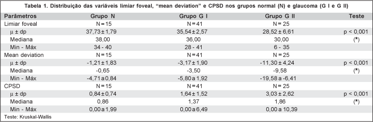 Os resultados do limiar foveal - LF, "mean deviation" - MD e do "corrected pattern standard deviation" - CPSD estão apresentados na tabela 1, e o "glaucoma hemifield test" - GHT na tabela 2.