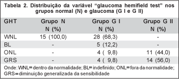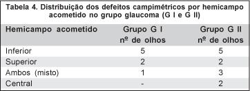 O hemicampo mais comumente acometido nos grupos G I e G II foi o inferior (Tabela 4).