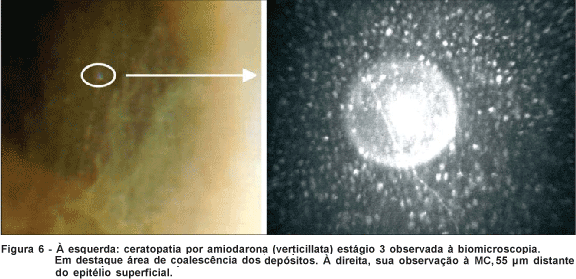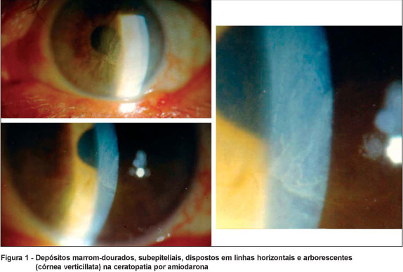 Várias drogas de uso sistêmico ou tópico (ocular) podem causar depósitos corneanos. A amiodarona, um antiarrítmico efetivo no controle de arritmias ventriculares e supraventriculares têm muitos efeitos colaterais documentados como: descoloração da pele, aumento da sensibilidade à luz, hepatite, disfunção tireoideana, fibrose pulmonar, supressão da medula óssea e depósitos corneanos(1). Outros efeitos colaterais oculares relacionados ao nervo óptico, retina, cristalino e pálpebras têm sido descritos(2). A ceratopatia induzida por amiodarona foi primeiramente descrita em 1968(3), e definida como depósitos marrom-dourados, arranjados linearmente em formato arboriforme ou de flores (whorl-shaped). Os microdepósitos corneanos são o achado mais comum nos pacientes tratados com amiodarona(2) e, geralmente, são bilaterais e simétricos(4-5). Estes depósitos não alteram a acuidade visual e geralmente desaparecem após 3 a 20 meses de descontinuação da droga(6-7). A prevalência desta ceratopatia varia entre 70 e 100%(2), mas apenas 10% dos pacientes reclamam de sintomas(8), como halos coloridos ao redor de luzes em ambientes escuros, quando a pupila está em midríase. O estadiamento, baseado na disposição dos microdepósitos, observável à biomicroscopia, é comumente usado para descrever o grau de comprometimento(9-11). Estes microdepósitos foram estudados com microscopia eletrônica, que revelou inclusões intracitoplasmáticas "lysossomo-like", confinado nas células epiteliais basais, anteriormente à camada de Bowman(12).