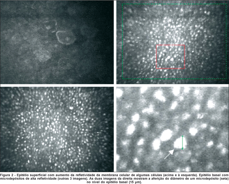 O epitélio basal foi o mais afetado (Figura 2). Nesta região, os depósitos caracterizaram-se como inclusões arredondadas, de bordas definidas, brilhantes e de alta refletividade, com diâmetros entre 2 e 15 µm de diâmetro. O epitélio superficial apresentou-se de morfologia normal, com áreas de maior refletividade no núcleo e na membrana celular de algumas células (Figura 2). O plexo nervoso subepitelial e assim como os nervos penetrantes do estroma anterior apresentaram-se sem alterações. Da camada de Bowman ao endotélio não foram observadas alterações.