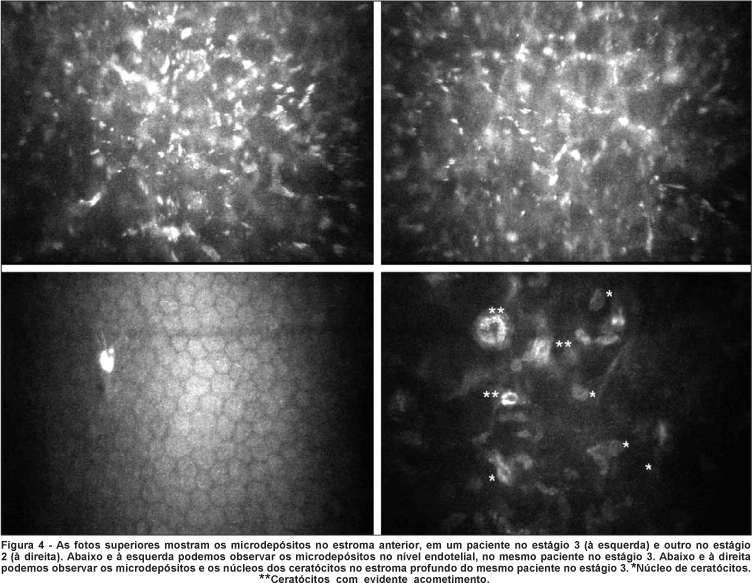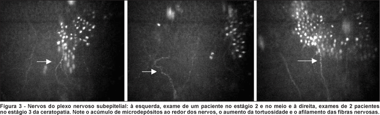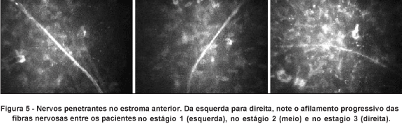 Os achados microscópicos in vivo no epitélio superficial e basal nos pacientes deste estágio são semelhantes ao do estágio 1. A região da córnea mais afetada foi o epitélio basal. Neste estágio de ceratopatia, foi observado que os microdepósitos se encontravam também na camada de Bowman, circundando o plexo nervoso subepitelial, (Figura 3) e no estroma anterior (Figura 4), transpondo a camada de Bowman. Os nervos do plexo nervoso subepitelial mostraram-se mais tortuosos. No estroma, os microdepósitos se apresentaram com formatos mais irregulares, bordas menos definidas que no epitélio, brilhantes com alta refletividade e medindo entre 2 e 32 µm de diâmetro. Nesta região, os microdepósitos estão mais afastados uns dos outros, levando a uma menor densidade de depósitos que no epitélio basal (Figura 4). Foram observados microdepósitos ao redor dos nervos penetrantes no estroma anterior, e afilamento destas estruturas (Figura 5). Nos pacientes em estágio 2 mais avançados, foram observados microdepósitos em todo estroma, com densidade decrescente, e algumas células endoteliais afetadas (Figura 4).