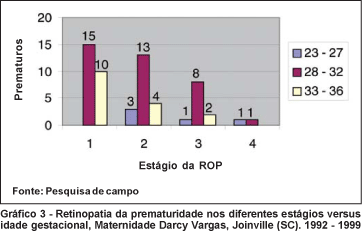O critério de "screening" também é motivo de discussão. Muitos autores, no início deste estudo, já defendiam que o peso ao nascimento deveria ser abaixo de 1.500 g e idade gestacional menor que 32 semanas(1,5,9-10,23,25-27). Neste estudo foi determinada idade gestacional menor ou igual a 36 semanas e peso ao nascer menor ou igual a 1.600 g. Os prematuros com idade gestacional de 36 semanas e 3 dias, era arredondada para 36 semanas. A idade gestacional prevalecia sobre o peso. Isto é, se a criança nascesse com 2.000 g e idade gestacional de 35, era incluída no estudo. Antes desta pesquisa não se sabia se a ROP existia entre os prematuros nascidos na MDV. Além disso, não se conhecia a faixa de peso e idade gestacional onde a retinopatia era mais prevalente. Por este motivo o limite de screening foi ampliado, e o fator mais importante foi a idade gestacional abaixo de 37 semanas.