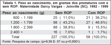O fator peso ao nascimento mostrou-se altamente significativo para o desenvolvimento da ROP. Apenas um caso dentre os prematuros sem ROP (grupo I) não teve a informação do peso ao nascimento.