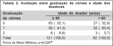 A tabela 1 representa a avaliação da associação entre a idade dos doadores e a graduação das córneas. Nenhum teste estatístico pode ser aplicado devido ao pequeno número de córneas das faixas de idade <12 anos e entre 13 e 21 anos.