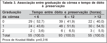 Como mostra a tabela 3 não foi encontrada diferença estatisticamente significante entre os grupos de córneas divididos segundo o tempo entre óbito e preservação em relação à distribuição da graduação das córneas no D1(p=0,316).