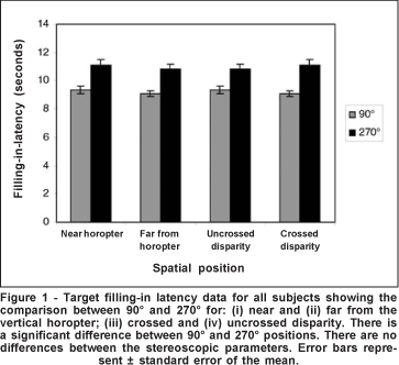 MÉTODOS: Criados anáglifos com dois discos de 0,3º de diâmetro, 0,5º de disparidade e 6º de excentricidade do ponto central de fixação. Estímulos foram apresentados na linha central do campo visual, nas posições 90º e 270º, com disparidade cruzada e não cruzada. Registrado o tempo gasto para o preenchimento do estímulo sob fixação estável. Testados dezoito indivíduos.
