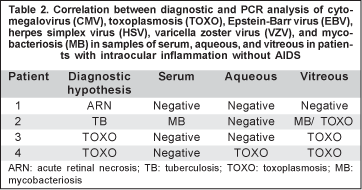 Wiedbrauk et al(35), reported an inhibitory effect in PCR analysis of aqueous and vitreous, however in our study of the PCR analysis we found no evidence of this inhibitory effect; when PCR result was positive it confirmed the clinical diagnosis.