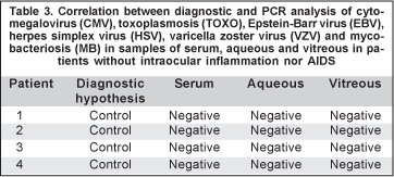 In patients with acute retinal necrosis, two of them had positive PCR results more than 3 months after onset the disease, and the other two had positive PCR result one month after the onset of the disease. In our study, duration of the disease did not interfere with the result of PCR analysis, in spite of the conclusions reached by de Boer et al.(37). There is a good correlation between clinical diagnosis and PCR amplification of infectious DNA from vitreous.