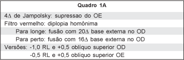 Ao exame oftalmológico a acuidade visual sem correção era de 20/20 no olho direito (OD) e 20/20 no olho esquerdo (OE). A paciente referia diplopia a qualquer distância. O "Cover test" mostrou ET' de 15 dioptrias prismáticas (D) e HT' e/d de 5D, com preferência pelo OD. Nas versões observou-se leve hipofunção do músculo reto lateral (RL) do OD e leve hiperfunção do músculo oblíquo superior (OS) em ambos os olhos. O ponto próximo de convergência era de cinco centímetros. O restante do exame oftalmológico apresentava-se sem alterações. Foi, então, solicitado teste ortóptico (Quadro 1A e 1B), exame neurológico e prescrito oclusão 1:1.