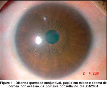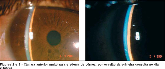 Havia importante quemose conjuntival bilateral embora esta não se evidencie tão claramente na imagem da figura 1. À biomicroscopia, notavam-se pupilas mióticas, mas fotorreagentes. A câmara anterior era rasa, a córnea clara e o humor aquoso sem alterações em ambos os olhos (Figuras 2 e 3). A pressão intra-ocular, por ocasião da primeira consulta, foi de 40 mmHg no olho direito e 38 mmHg no olho esquerdo.