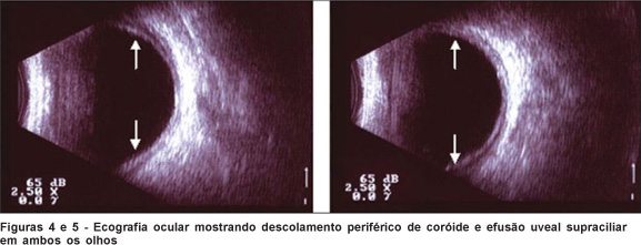 No mesmo dia, após a resposta favorável à medicação inicialmente administrada, foi realizada ecografia ocular, que mostrou descolamento periférico de coróide e efusão uveal supraciliar em ambos os olhos (Figuras 4 e 5).