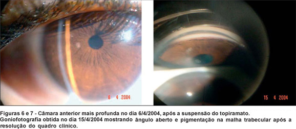 É conhecido o fato de que a elevação aguda da pressão intra-ocular por períodos prolongados, qualquer que seja sua etiologia, leva a um dano severo e irreversível do nervo óptico. É necessário que o oftalmologista procure não somente tratar a crise de glaucoma, mas também e sempre que possível, busque as suas causas. Somente assim será possível estabelecer a estratégia mais adequada para o manejo de cada paciente, evitando iatrogenias adicionais e atuando eficazmente para a sua mais pronta recuperação conforme foi realizado com esta paciente que recuperou a profundidade da câmara anterior e teve normalizada sua pressão intra-ocular nos dois olhos após a suspensão da medicação (topiramato).