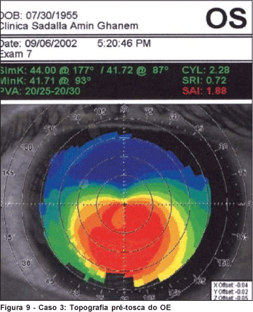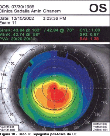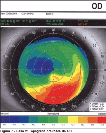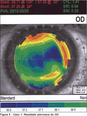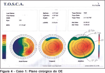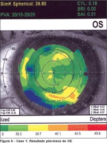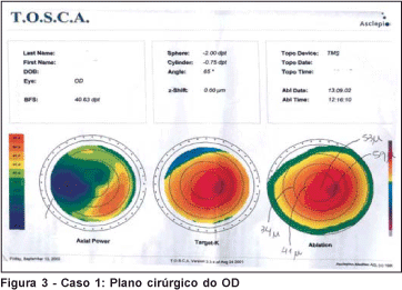 Paciente MRP, 32 anos, administradora, submetida à cirurgia para a correção de miopia há 5 meses, dos dois olhos, com a técnica do LASIK e insatisfeita com a visão. Refração pós-cirúrgica: OD -2,00 DE -1,25 DC x 65° e OE -0,75 DE -0,50 DC x 40°. A acuidade visual com correção (AVcc), em ambos os olhos (AO), era de 20/40. A topografia apresentava astigmatismo irregular devido a uma descentralização pós-LASIK em AO (Figura 1 e 2). O padrão de ablação foi calculado baseado na topografia utilizando-se o TOSCA (topographically supported customized ablation - sistema de ablação personalizada baseada em topografia), e está demonstrado nas figuras 3 e 4. As topografias pós-operatórias (6 meses) mostravam maior regularidade corneana na zona óptica (Figuras 5 e 6). A AV sem correção (AVsc) em AO melhorou para 20/30 e a AVcc para 20/25 (Refração: OD -0,25 DE -0,50 DC x 80°; OE plano -0,50 DC x 80°).