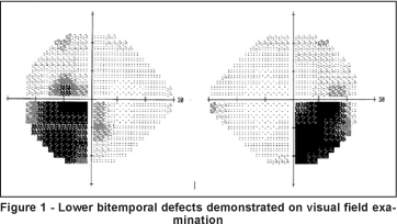 The diagnosis of chiasmal syndrome can be divided into compressive and non-compressive lesions. Compressive lesions are a consequence of space occupying processes, usually from a pituitary adenoma with suprasellar extension (the most commom cause), a craniopharyngioma, a meningioma or an aneurysm(1-3). Studies of the frequency distribution of scotoma patterns in patients with perichiasmal affections showed that the majority of scotomas was attributable to an involvement of the temporal hemifield in both eyes. The second most commom visual fields defect was anterior junction syndrome, characterized by advanced central scotoma in one eye and contralateral superior temporal field defect. Although bitemporal scotoma are very commom in chiasmal syndromes, the involvement of the lower quadrants were seen in only 0.3% of patients with compressive diseases and 1% of patients with chiasmal syndrome caused by diverse disesases(4).