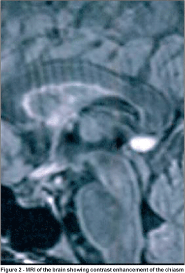 RESULTADOS: A ressonância magnética revelou espessamento e imagens de cavitações na medula espinal, assim como espessamento do quiasma óptico, acompanhado de aumento na captação do contraste. Não apareceu imagem sugestiva de processo desmielinizante no cérebro, tronco cerebral ou cerebelo. O exame 24-2 (campo visual central) demonstrou defeito bitemporal inferior, revelando assim o comprometimento do chiasma.