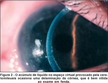 Exames de microscopia confocal mostram alterações da morfologia e arquitetura intercelular na interface do flap, o que sugere que a ceratomileusis na cirurgia de LASIK produz um espaço virtual permanente a esta profundidade do estroma corneano(17). Tal fato também foi evidenciado por relatos de levantamento do flap da ceratomileusis após 18 meses da cirurgia para reaplicação do excimer laser(18). Desta forma, o espaço virtual da interface pode ser distendido durante a formação do edema de córnea.