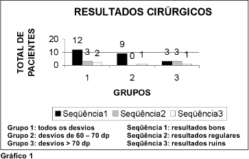 Dos pacientes com desvio maior que 70dp, 7 (41,1%) no total, 3 (42,8%) destes obtiveram bons resultados, 3 (42,8%) regulares e 1 (14,2%) ruim (Gráficos 1 e 2). A cirurgia em 3 músculos ( Rc ¾ Rs no pior olho, mais recuo do RM do olho fixador) só foi feita em 3 pacientes, tendo sido 1 com bom resultado, 1 regular e outro ruim. Porém estes pacientes não foram incluídos na casuística, por terem fugido ao objetivo do trabalho.