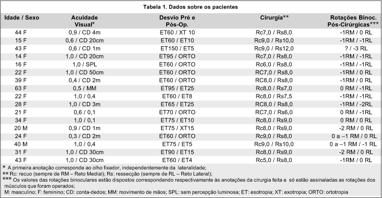 Com relação às rotações binoculares, tivemos apenas dois casos com hipofunção de -2 de RM recuado. Analisando-se o RL, observa-se que houve um caso de -3 do RL ressecado (Tabela 1), no entanto, este paciente tinha -7 antes da cirurgia (paresia de VI nervo) e um desvio exagerado (150dp).