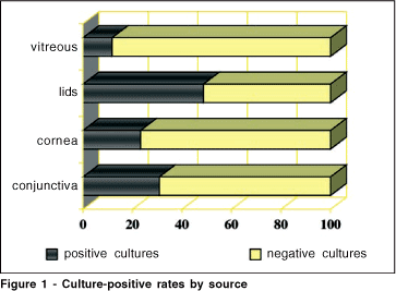 One thousand nine hundred and sixty-four (1964) cultures were submitted during 1987-2001. Twenty-six percent were positive (514). Lids and conjunctiva were the sources with the highest positive rates (48.7% and 30.9% respectively) (Figure 1).