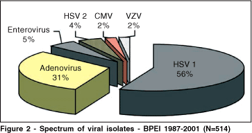 HSV 1 remains the most frequently isolated virus from ocular sites in general (56%). Typically, ocular disease is caused by herpes type 1 however, 3% of corneal viral isolates in our study were due to HSV 2. It has been suggested that ocular HSV type 2 infections may have a less favorable outcome(13), so maybe it would be interesting to know the type of HSV in ocular infection. There are no recent studies concerning the incidence of ocular infection by HSV 1 versus HSV 2(14). The first study suggesting transmission of HSV 2 from the genital site to the eye was published by Oh in 1976(15). The author reported 2 cases of blepharoconjunctivitis and 1 case of keratoconjunctivitis in 2 adults with prior history of genital disease and 1 child with close contact with her sister who apparently had genital disease. In 1978, Neumann-Haefelin found in a continuous series of 457 patients that 154 had HSV 1 and 3 had HSV 2 (1.9%) when isolating and typing virus(13). There is one report of simultaneous HSV 1 and 2 infecting a cornea in a patient with AIDS(16). Recently, Inoda reported a case of stromal keratitis and anterior uveitis due to herpes simplex virus type 2 in a young child(17). The higher prevalence of HSV 2 in ocular disease found in our study might be a consequence of the increased incidence of genital HSV in the United States(13). This change in the epidemiology supports the importance of laboratory diagnosis in viral diseases. It is also fundamental in order to confirm resistance to antivirals. Some cases of herpes keratitis resistant to acyclovir have already been published(18-19) and some studies have shown that type 2 HSV isolates have higher ID 50 (50% of inhibitory dose) values than type 1 when tested for acyclovir sensitivity(20).
