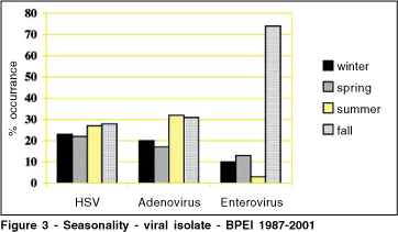 HSV 1 was the most frequent agent isolated from all positive culture (56%), followed by adenovirus (31%) (Figure 2). No seasonal variation was observed for HSV. However, adenovirus was more likely recovered during summer and fall. Enterovirus was more frequently seen during the fall as can be observed in Figure 3.