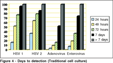 Average detection time ranged from less than or equal to 24 hours (HSV) to 30 days (CMV, adenovirus). HSV 1 and HSV 2 were the fastest isolates recovered from traditional cell cultures compared to the other virus. About 78% of HSV was recovered within 72 hours. Time to detection for other virus can be observed in Figure 4. The most sensitive cell lines were the A549 (97.2%) and MRC5 (57.3%).