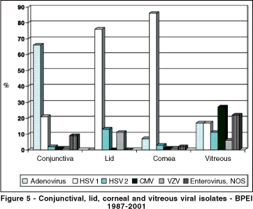 RESULTS: One thousand nine hundred and sixty-four (1964) cultures were submitted during 1987-2001. Twenty-six percent were positive (514). Human herpesvirus 1 was the most frequent agent isolated from all positive culture (56%). Adenovirus was the most common virus isolated from conjunctiva (66%), human herpesvirus 1 from lid and cornea (76%, 88%) and cytomegalovirus from vitreous (27%). Some unusual pathogens were recovered from conjunctiva as cytomegalovirus and from cornea as adenovirus, enterovirus and cytomegalovirus. Recognition of common viral syndromes was human herpesvirus 1 (88%), epidemic keratoconjunctivitis (88%), acute hemorrhagic conjunctivitis (70%) and varicella zoster virus (100%). However, some misdiagnosed cases were observed. Thirteen percent of conjunctivitis thought to be caused by herpes were due to adenovirus, 3.2% to Enterovirus, 3.2% to varicella zoster virus and 3.2% to human cytomegalovirus. Also, 5% of cases with a clinical diagnosis of herpes keratitis were caused by adenovirus and 2.7% by enterovirus. Finally, 4.8% of cases thought to be adenovirus conjunctivitis were herpes conjunctivitis.