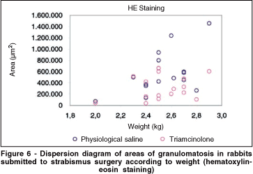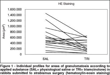 The present study was analytical, experimental, prospective, randomized and blinded, and employed the animal model described by Minguini et al.(12). The protocol was divided into 2 steps: In step 1, the inflammatory response at the site of muscle insertion was assessed, following the use of perimuscular triamcinolone. In step 2 the same procedures were carried out, except for cauterization of underlying sclera (intensified surgical aggression), and the inhibiting effect of triamcinolone acetate upon fibrosis and inflammatory response was verified.