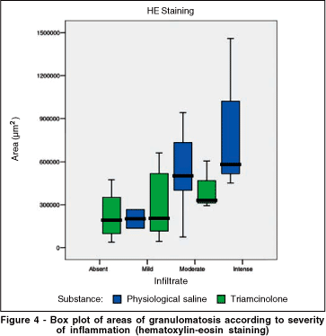 4) In the group treated with triamcinolone, the measured area was the same, on the average, for the two staining media (HE and MT) (p=0.565).