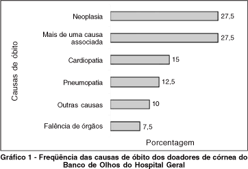 As causas do óbito estão apresentadas no gráfico 1. Observa-se que as causas mais freqüentes foram a neoplasia e mais de uma causa associada (trauma vascular e parada cardiorrespiratória; aneurisma abdominal e parada cardiorrespiratória; neoplasia abdominal e ascite metastática; neoplasia de útero e parada cardiorrespiratória; insuficiência renal aguda e broncopneumonia; insuficiência renal aguda e falência de órgãos; neoplasia de ovário e insuficiência ventilatória; neoplasia de intestino e parada cardiorrespiratória; neoplasia de estômago e falência de órgãos; insuficiência renal aguda e traumatismo de crânio; neoplasia cerebral e insuficiência respiratória).