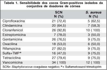 O presente estudo corrobora os achados da literatura no que se refere à alta freqüência de isolamentos de Gram-positivos, principalmente de SCN, microrganismo relacionado, aproximadamente, a 70% dos casos de endoftalmite pós-cirúrgica(17). Alguns autores observaram em amostras de "swabs" usadas para avaliação da microbiota da conjuntiva de pacientes submetidos à cirurgia oftalmológica, o crescimento entre 27% a 54% de SCN(18-19).