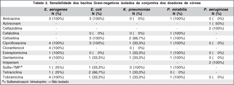 A baixa freqüência de Gram-negativos, neste estudo, foi observada em outros trabalhos semelhantes, entretanto, com discordâncias em relação aos tipos bacterianos isolados. Para outros autores o Haemophilus sp. foi o Gram-negativo mais freqüente porém, não se isolou tal microrganismo neste estudo(16). Paralelamente, Proteus mirabilis foi encontrado em poucas amostras oculares confrontando outros achados publicados(20).