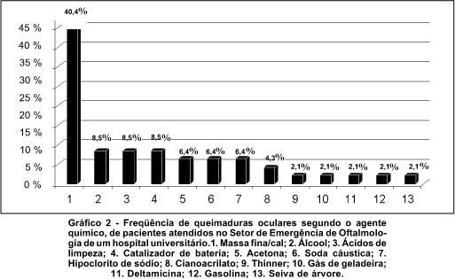 Vários agentes químicos foram envolvidos nos quadros de queimadura química ocular avaliados neste estudo. Dentre os mais freqüentemente citados destacam-se: (Gráfico 2).
