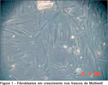 A adição de meio DMEM/F12 com SFB a 15% foi feita a cada 3 dias, com acompanhamento e exames das culturas sob microscópio de inversão, para a observação da morfologia e comportamento dos fibroblastos (aderência, migração e proliferação) até que se obtivesse um número satisfatório de células em cultura (Figura 1), definido pela observação de células com alta atividade mitótica e não confluentes, ocupando aproximadamente 2/3 da capacidade do frasco, quando então, prosseguiu-se com a repicagem das células.