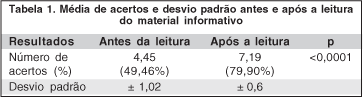 Trinta e um indivíduos responderam aos dois questionários. A média de acertos antes da leitura do material informativo foi de 4,45 questões (49,46%) com desvio padrão (DP) de ±1,02 acerto. Após a leitura o índice de acertos no mesmo questionário subiu para 7,19 questões (79,9%) DP ±0,65. A diferença foi estatisticamente significante p<0,0001 (Tabela 1).