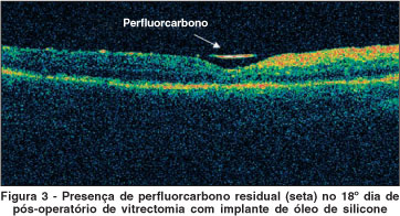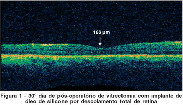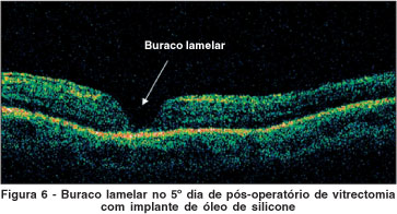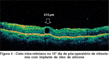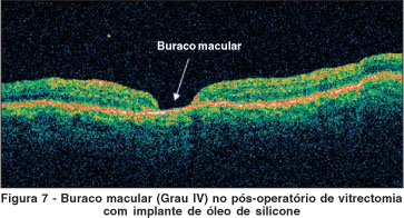 Alguns autores mostraram um estudo com 14 pacientes submetidos a vitrectomia e óleo de silicone (como alternativa substituta para o gás) na cirurgia de buraco macular, sendo que o seguimento desde o 1º DPO foi realizado com OCT, tendo este um importante papel para detectar o fechamento do buraco, confirmando precocemente o sucesso cirúrgico(19). Neste estudo, observou-se na oftalmoscopia indireta a aplicação retiniana em todos os casos no pós-operatório. Na biomicroscopia de fundo foram constatados edema de mácula, gotícula residual de perfluorcarbono e buraco macular não vistos na oftalmoscopia indireta. O OCT, além de demonstrar o que a biomicroscopia de fundo e a oftalmoscopia indireta evidenciaram, também constatou a presença de um "cisto" intra-retiniano, membrana epi-retiniana e buraco lamelar, não detectados pelos outros métodos propedêuticos.