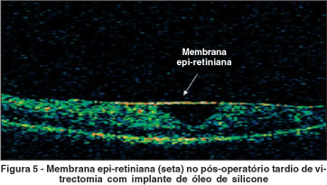 IIB, sexo masculino, 34 anos, vítima de trauma perfurante e corpo estranho intra-ocular (CEIO) no olho esquerdo há 8 meses, submetido à facectomia com implante de lente intra-ocular, vitrectomia e óleo de silicone, apresentando acuidade visual de 20/200. O exame biomicroscópico, prejudicado pela opacidade de cápsula posterior, evidenciou um edema de mácula. O OCT, além de demonstrar o espessamento macular (601 µm na região foveal), constatou uma estrutura de hiper-refletividade, anterior à membrana limitante interna, tendo como diagnóstico uma membrana epi-retiniana (MER) (Figura 5). Assim, foi programada uma intervenção cirúrgica para retirar o óleo de silicone, remover da MER e realizar uma injeção de triancinolona intravítrea para regressão do edema de macular.