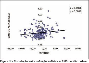 Assim, não só nenhum dos resultados observados na literatura corrobora os resultados deste estudo, como em alguns casos, apontam resultados opostos, já que neste estudo a correlação foi positiva entre olhos hipermétropes e aberração esférica e RMS de alta ordem, diferentemente dos estudos aqui relatados que ou não encontraram nenhuma relação, ou observaram relação positiva com olhos míopes.
