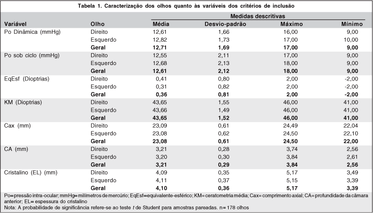 Os dados do exame oftalmológico e de ecobiometria que antecederam a UBM estão resumidos na tabela 1. Foi observado que os olhos incluídos neste estudo apresentavam pressão intra-ocular com pupila dinâmica (média ± desvio-padrão) de 12,71 ± 1,69 mmHg (variando de 9 a 17 mmHg), pressão intra-ocular após midríase de 12,61 ± 2,12 mmHg (variando de 9 a 18 mmHg), equivalente-esférico médio de 0,36 ± 0,81 dioptrias (variando de - 2,00 a 2,00 dioptrias), ceratometria média (KM) de 43,65 ± 1,52 dioptrias (variando de 41,00 a 46,00 dioptrias), e comprimento axial médio de 23,08 ± 0,61 mm (variando de 22,00 a 24,50 mm). A profundidade média da câmara anterior foi e 3,21 ± 0,29 mm (variando de 2,56 mm a 3,84 mm) e a espessura média do cristalino foi de 4,10 mm ± 0,36 mm (variando de 3,39 a 5,17 mm). Não foram observadas diferenças estatisticamente significativas para as variáveis dos critérios de inclusão entre olhos direitos e esquerdos (p>0,05; "t" de Student).