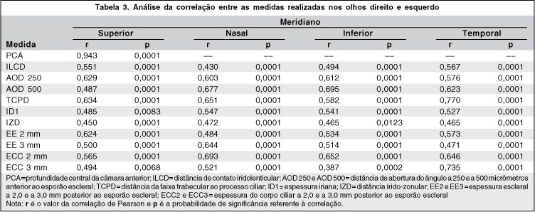 Não foram observadas diferenças estatisticamente significativas entre olhos adelfos quanto às variáveis morfométricas após sua estratificação por meridiano, com exceção da variável ILCD no meridiano superior e da variável AOD 500 no meridiano temporal. Portanto, apenas duas variáveis em dois meridianos distintos apresentaram diferenças estatisticamente significantes. Não obstante, essas diferenças foram inferiores a 0,025 mm situando-se, portanto, no limite de precisão da UBM. Pode-se considerar, portanto, estas diferenças como pequenas e clinicamente não-significativas, o que permite concluir que as variáveis estudadas apresentaram simetria de medidas entre o OD e o OE no grupo de pacientes estudados.