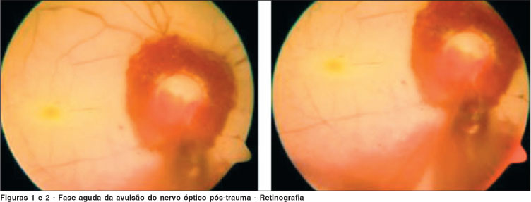 A história clínica associada aos achados fundoscópicos revelou um quadro típico de avulsão completa do nervo óptico direito. A tomografia computadorizada de crânio e órbitas não demonstrou ocorrência de fratura óssea. O paciente permaneceu sob acompanhamento clínico durante uma semana em nosso serviço, sem alteração de seu exame clínico. Após este período não compareceu mais aos retornos marcados.