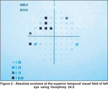 The patient returned after one week with the visual field perimetry revealing an absolute scotoma in the superior temporal visual field justifying the patient's symptom (Figure 2); moreover, he also referred an eighty percent (80%) improvement with the miotic therapy.