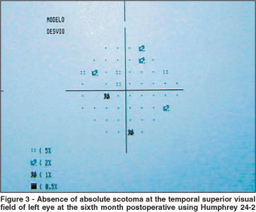 At the third postoperative month, the patient referred a significant improvement with reduction of the dark shadow in the temporal visual field, which improved even more at the 6th month postoperative visit confirmed by visual field perimetry (Figure 3). Biomicroscopy of the anterior segment revealed an increased density at the remaining anterior capsule overlapping the IOL edge. At this point, the patient reported that he spontaneously discontinued the medication. Then, regarding this controlled situation the patient was requested to return every 6 months for control postoperative examinations.