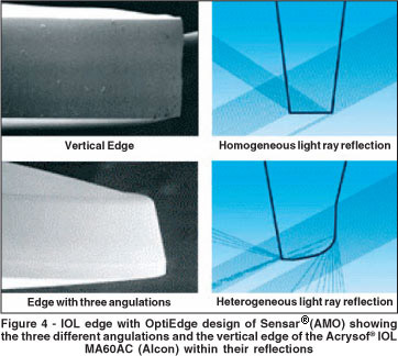 In order to reduce these symptoms, new IOL designs were created, such as the "frozen square-edge" proposed by the Acrysof IOL second generation (Alcon) and the "three angulations square-edge" also named Optiedge proposed by Sensar IOL (AMO), which has three different angulations, the anterior is round, the posterior is vertical, and the intermediate is built at 45 degrees between them (Figure 4). By these modifications, a significant loss of light ray reflex at the square edge occurs, resulting in less discomfort for the patient.