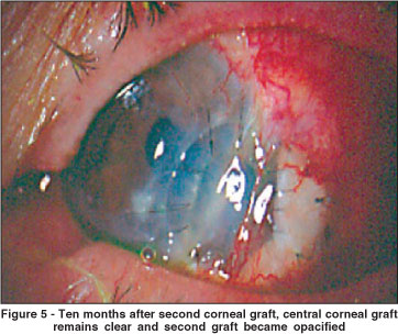 Within one month of initiation of treatment for Nocardia, the patient was noted to have less pain and vision improved to 20/200. The original graft remained clear and compact centrally. At her last follow-up visit, sixteen months after her second corneal graft (Figure 5), the patient's final BCVA was 20/70.