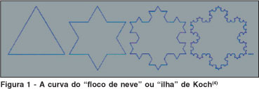 A auto-similaridade significa que cada parte menor do objeto ou processo fractal se assemelha ao todo. Para exemplificar, considere-se um fractal bastante conhecido: a "curva de von Koch", criada pela substituição de um segmento de reta por quatro outros segmentos com um terço do comprimento original, conforme explicitado na figura 1. O fractal é o resultado da repetição ad infinitum desse processo, que, se construído sobre um triângulo eqüilátero, dá origem à "ilha" ou "floco de neve" de Koch(4).