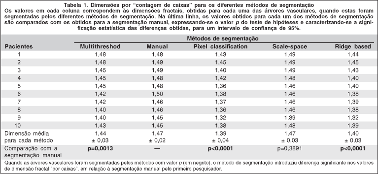 Os valores das dimensões fractais por "contagem de caixas", de "informação" e de "massa-raio" seguiram uma distribuição gaussiana para todos os métodos empregados e encontram-se discriminados nas tabelas 1, 2 e 3, respectivamente. As árvores vasculares apresentaram menores valores de dimensão quando segmentadas pelos métodos "pixel classification" e "ridge-based detection" e os maiores valores de dimensão quando segmentadas manualmente ou por "scale-space". Houve diferença estatisticamente significativa entre os valores das dimensões fractais por "contagem de caixas" e de "informação", quando os vasos foram segmentados manualmente ou pelas técnicas de "pixel classification", "ridge-based detection" ou "multithreshold", porém não houve diferença estatisticamente significante entre os valores de dimensão fractal, quando os vasos foram segmentados manualmente ou pela técnica automática de "scale-space".