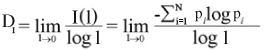 Onde é denominada entropia de Kolmogorov e pi é a probabilidade de encontrar-se um ponto do objeto ou processo fractal em uma circunferência de raio l, quando l tende a zero.