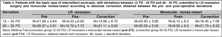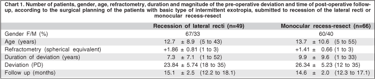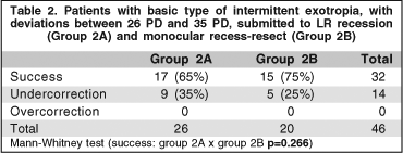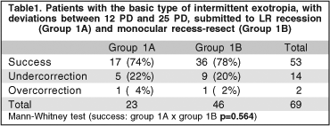 Other authors(10), in 2001, compared 103 cases of X(T) of the basic type and pseudo-divergence excess, considering orthotropia ±10 DP as surgical success, after a 1 year follow-up period(11). They obtained success in 26 (56%) out of the 46 patients submitted to recession of the lateral recti, and in 34 (60%) out of the 57 patients submitted to monocular recess-resect procedure. There was no statistically significant difference between the surgical results in either of the procedures.